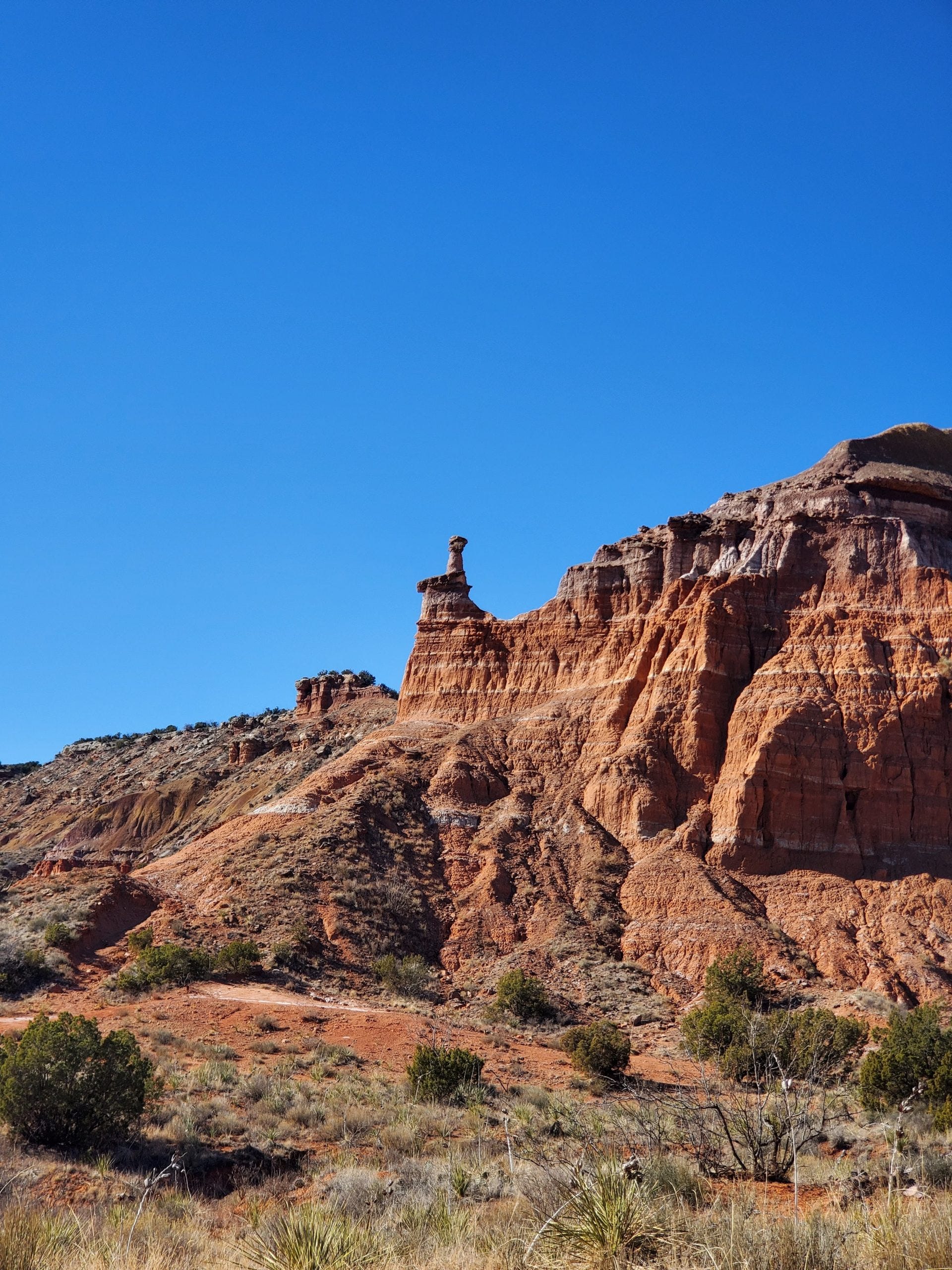 Clearly, it was a slow start to the day. We had a late breakfast, the kids got secondary snacks, and once I had more snacks and water packed and ready to go, we headed out for the Lighthouse Trail, the most popular hike in the park. The 2.7-mile trail (one-way) takes visitors to the most famous landmark in the state park. It is also the most dangerous hike in the park, particularly for summer visitors attempting the hike along the desert canyon floor without proper hydration and necessary rest. Thankfully, we had risked a Christmas break trip to Palo Duro. The only thing we had to worry about was temperatures that were too cold, not deathly hot.