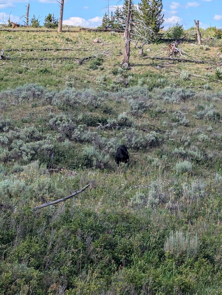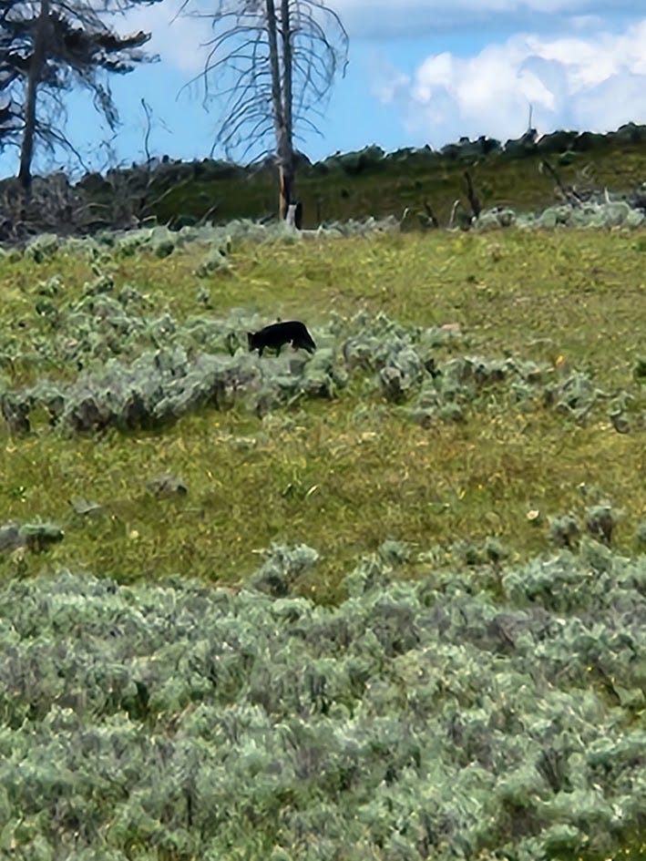 As we continued our drive north, we ran into one of the many infamous Yellowstone traffic jams, only this one was worth the stop. We experienced a rare daytime black wolf sighting off of the road. Since Jeff had a better zoom camera on his phone, he was able to snap a picture of the four-footed beauty, which we originally thought might be a black bear.