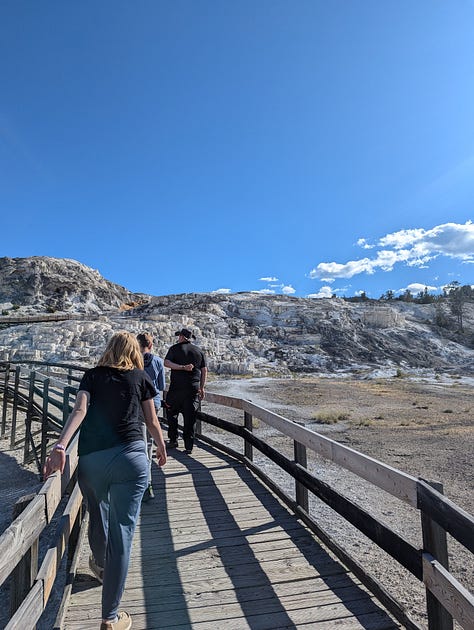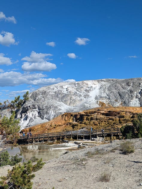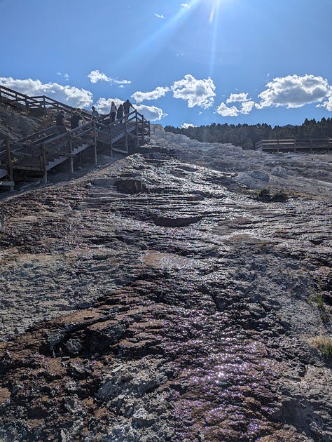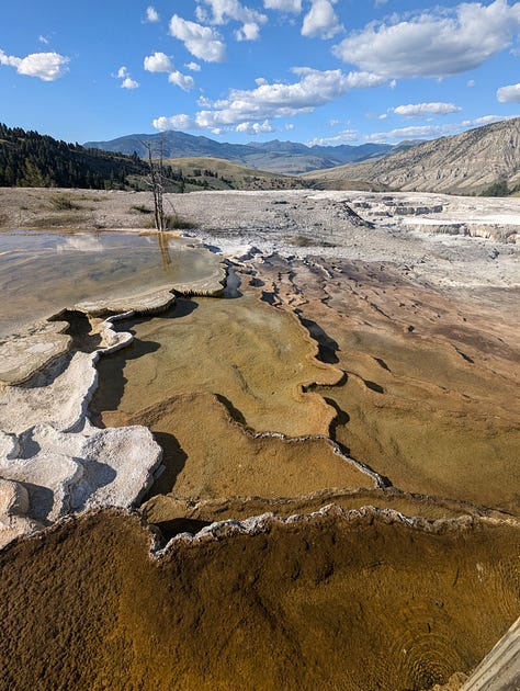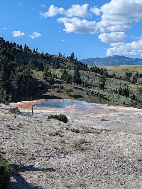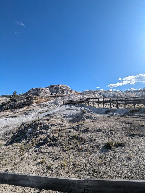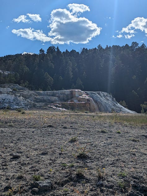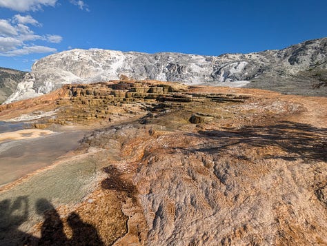 My family stayed at the Mammoth Hot Springs Hotel when I was a kid, and while I don’t remember much about the whole park, I do remember the hotel. And Jeff and I had enjoyed our hike around the hot springs when we visited in our 20s. We had been hoping to make it to the visitor center before it closed so we could tour the Fort Yellowstone historical buildings (the US Army administered the park until the early 1900s), but all of our other siteseeing for the day slowed us down. Instead, we would have to just enjoy some ice cream at the hotel complex and then a hike around the ever changing hot springs. We ended our day of siteseeing with a drive around the Upper Terrace Area, the whole reason we had made this our first day final destination.
