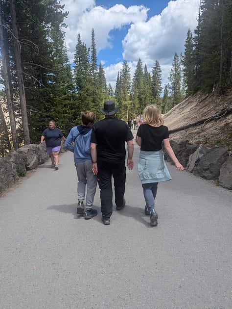Our family left Cody, Wyoming and our two hours at the Buffalo Bill Center and headed west, across the desert, past the Buffalo Bill Reservoir, and back up into the mountains guarding the entrance to Yellowstone National Park. When Jeff and I had traveled to Yellowstone twenty years before, we had reached the entrance with the sun still high enough in the sky we could see the park, but by the time we reached our campsite in West Yellowstone on the opposite side of the park, we were pitching our tent in the dark.