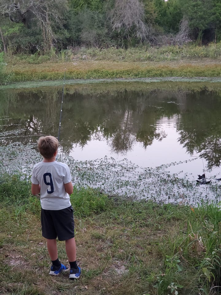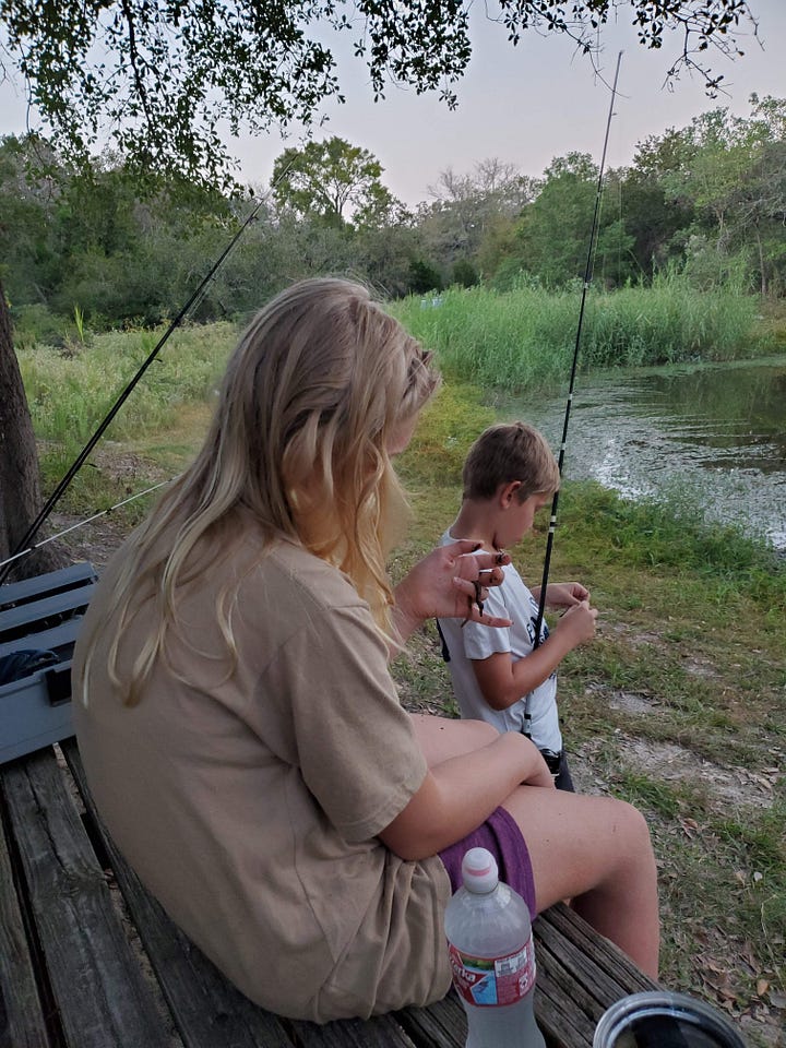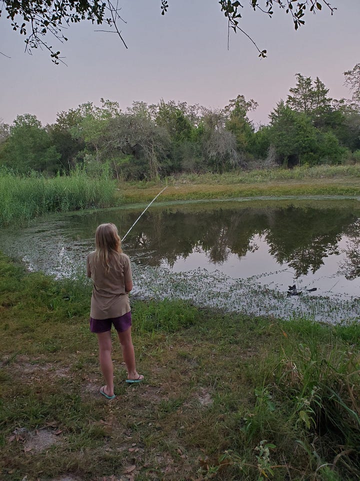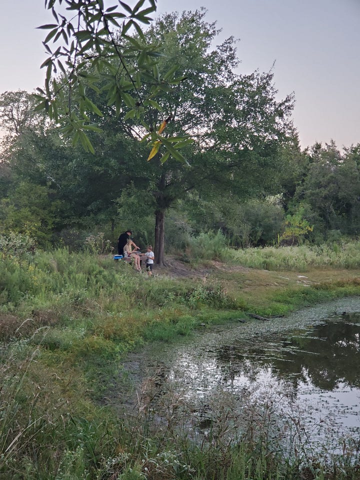 By the time we returned to the kids, Jeff decided that the best option for fishing would be the shallow but supposedly stocked family fishing pond, particularly because it was secluded. While I made dinner, he took both kids to the hole to try to catch more than just weeds.