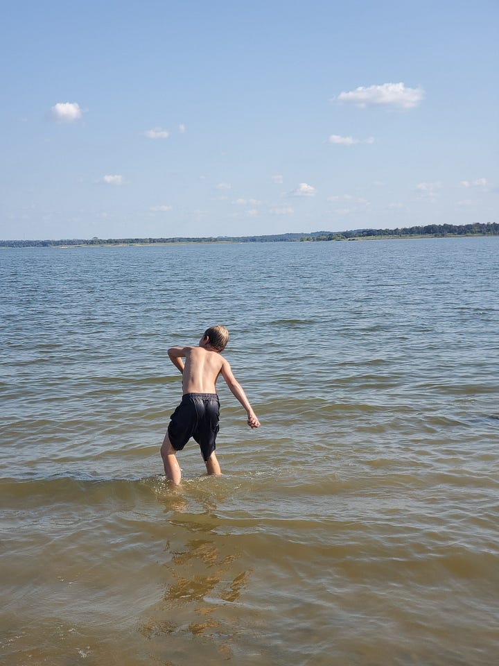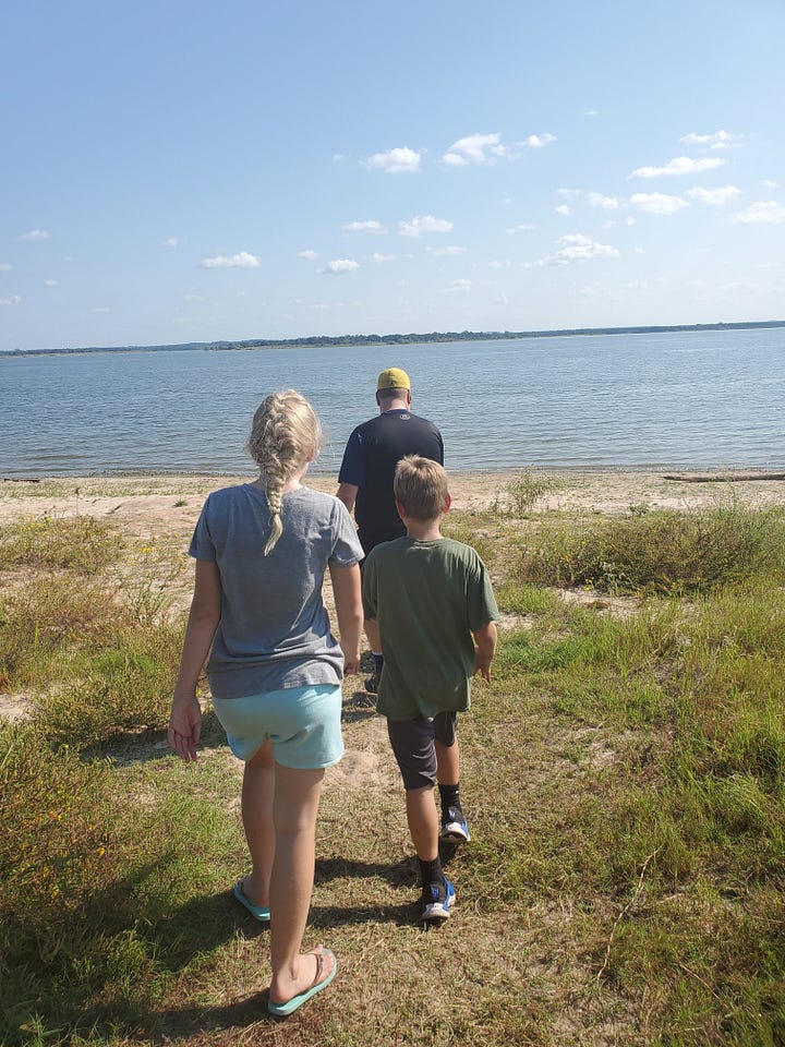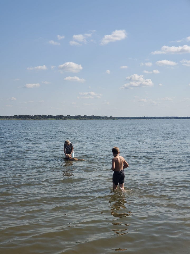 We had no idea that the lake would be so close to our campsite, nor that there would be a swimmable beach area, so we didn’t even think to bring our swimming gear. But with the October Texas temperatures climbing into the low 90s, our kids decided it didn’t matter. They spent the next hour swimming in their shorts and t-shirts while Jeff and I enjoyed the view from the shore.