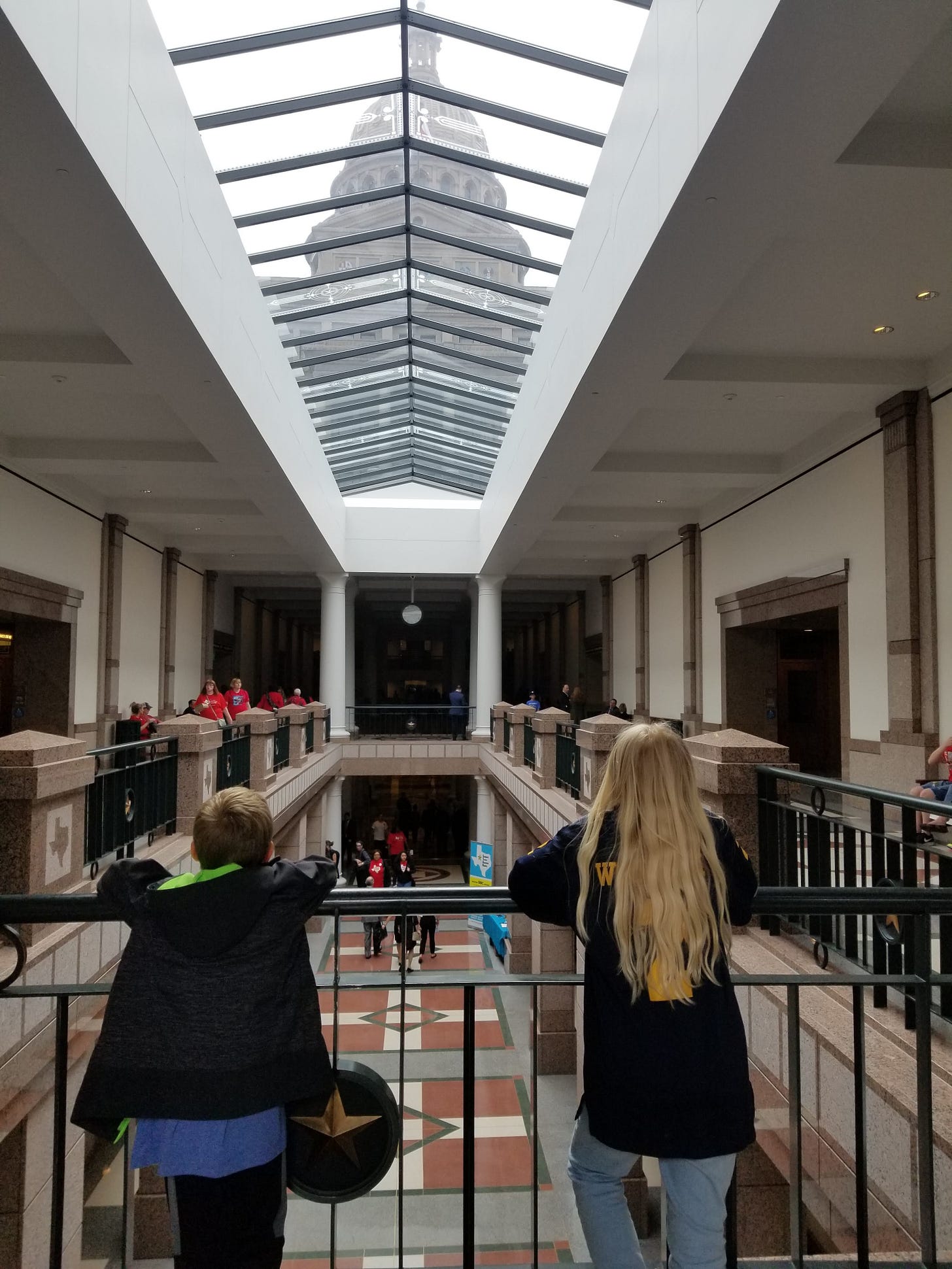 On that particular spring day, as we approached the state capitol, we discovered that a large group of Texas public school teachers were protesting the legislature, which was in session. Suddenly we weren't just getting a tour of the place where laws were made; we were showing our kids what it means to exercise our First Amendment rights. It also opened up discussion about issues facing public education. At the time, I was still teaching in a Lutheran school and our kids were attending a Lutheran school.2 But this was a chance for me to share with my own kids my support for my public school colleagues and to help them start to see the issues that faced my public school teaching peers and their students. As we tried to listen to the tour guide over the chants of the teachers circling around every level of the rotunda, I didn't complain but proudly took a picture of them working for the betterment of their students and Texas schools.