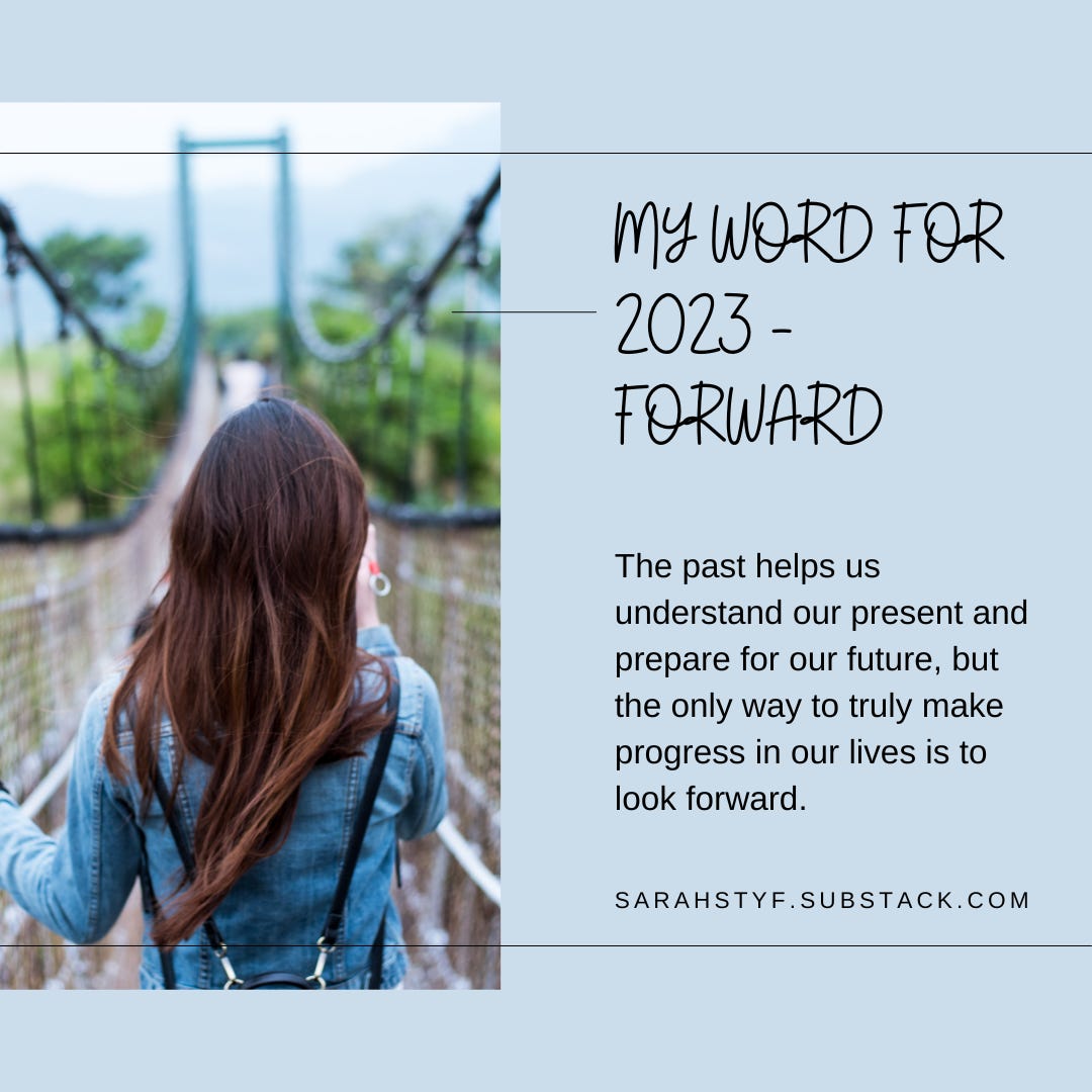 For 2023 I have chosen the word “forward.” It is a word that encompasses many of the other words from past years but takes it a step further. It is a word that implies goal setting (and there is some of that), but it means that I want to keep looking to the future instead of constantly looking back. I believe in the importance of history, of knowing and reflecting on our past so we can better understand our present and heal for a better future. But a better future only happens if you decide to take that knowledge and move forward with it, correcting the mistakes made and taking risks, even if that means making different mistakes along the way.