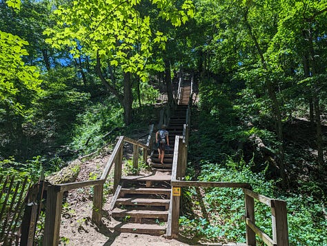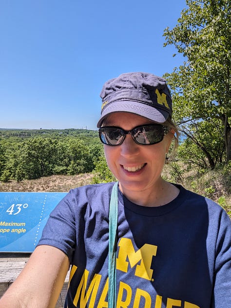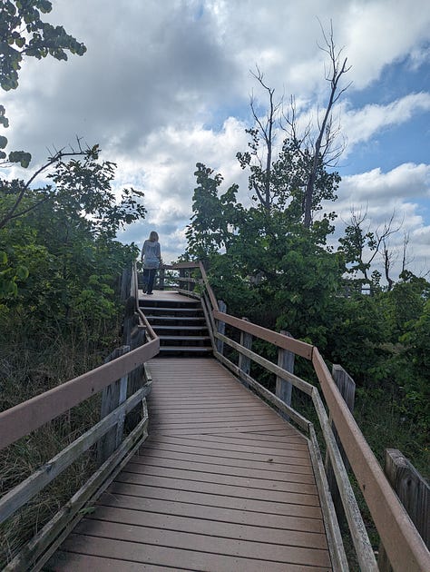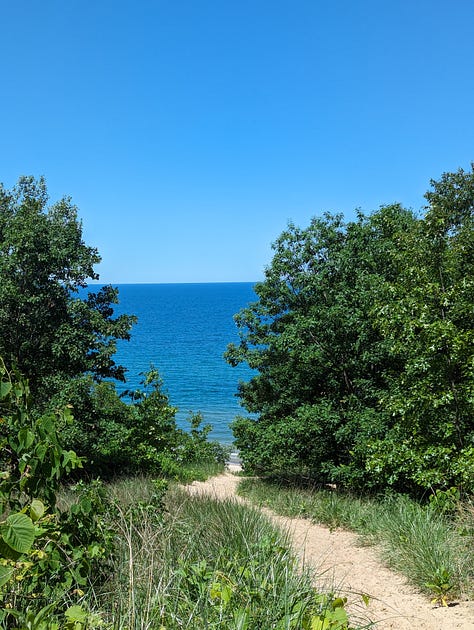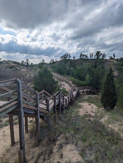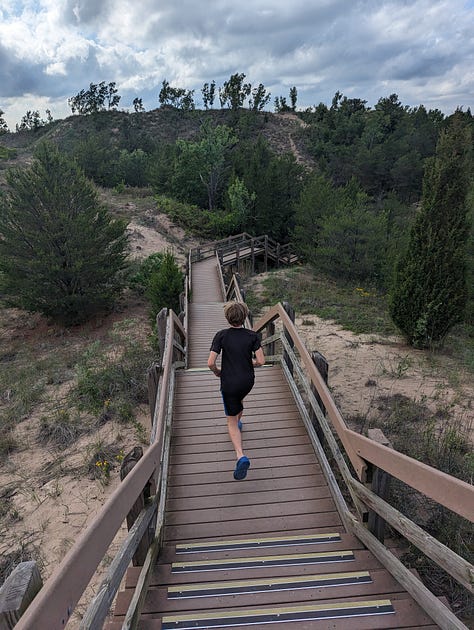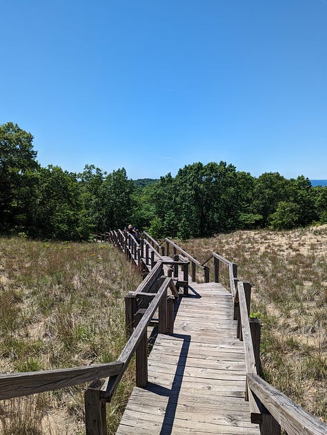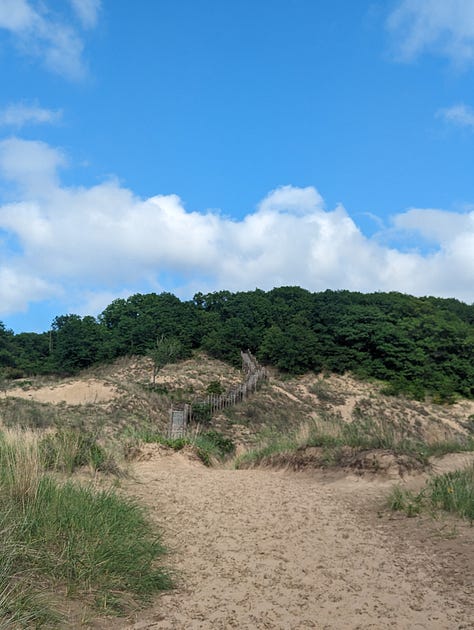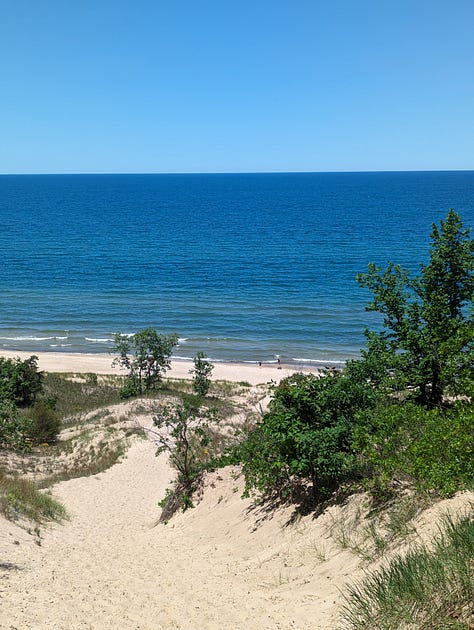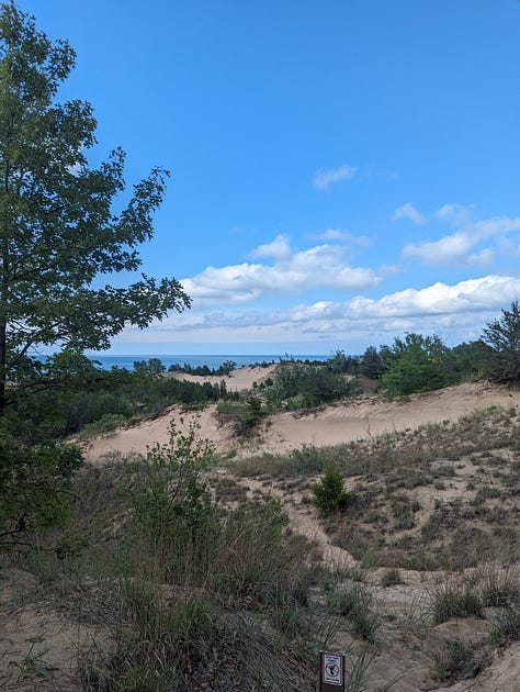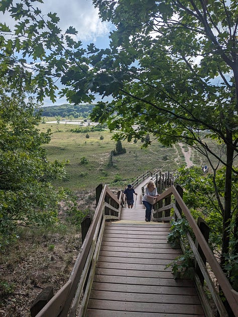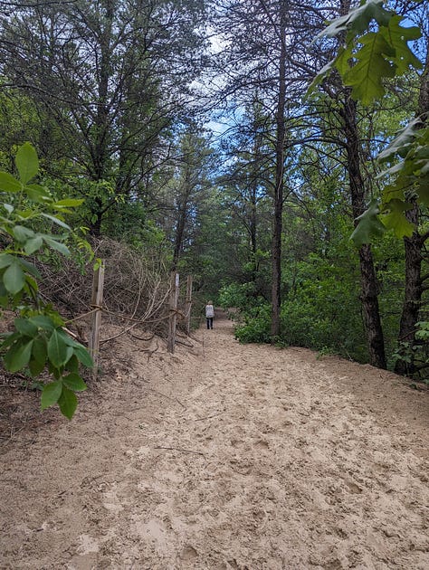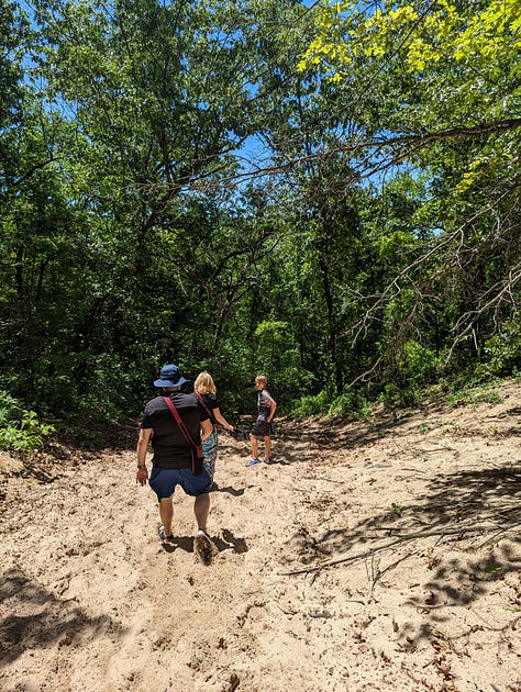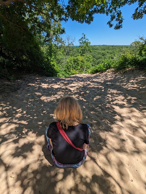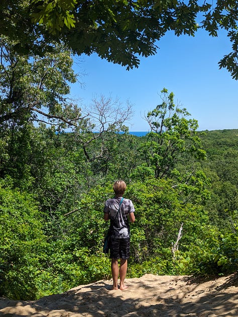 The next day our son couldn’t wait to get onto the dunes. It was the only fully clear day in the forecast, so as soon as we finished breakfast we packed up the truck and drove to the nature center, which we quickly realized was completely unnecessary. Everything in the state park is an easy walk or bike ride, but we had forgotten just how close everything was. Our kids toured the nature center, we checked the hiking maps, and then we embarked on the 3 Dune Challenge, a 1.5-mile hike with climbs of 552 vertical feet while digging shoes or bare feet into soft sand. It was not without challenges, but it was a beautiful, clear day and we could see Chicago thirty miles across Lake Michigan.