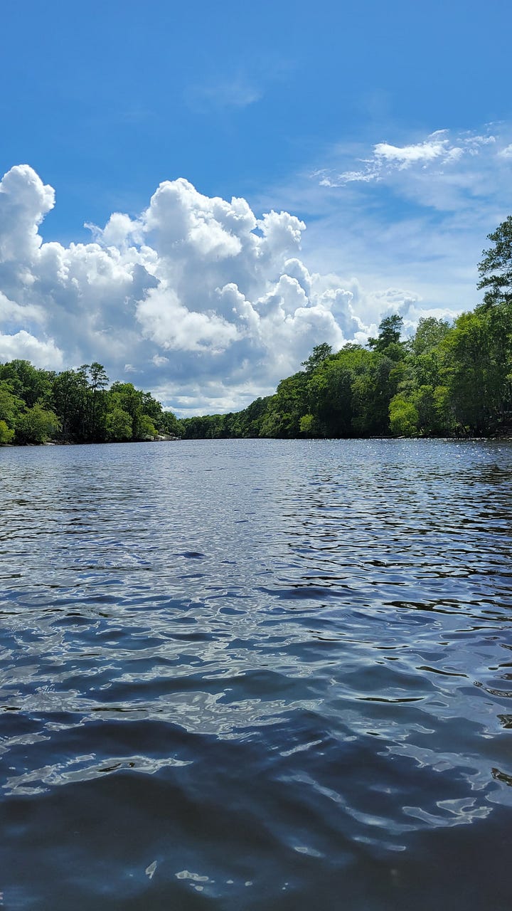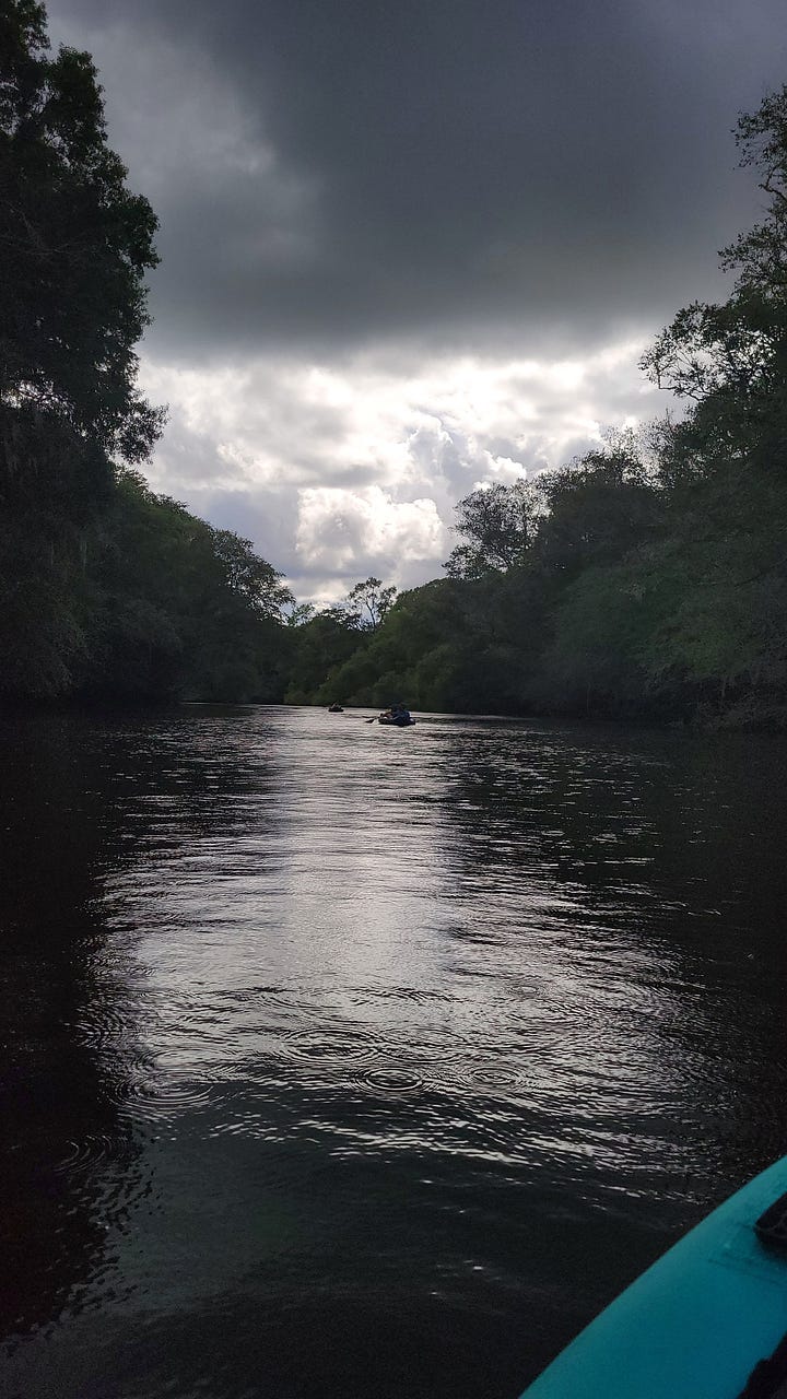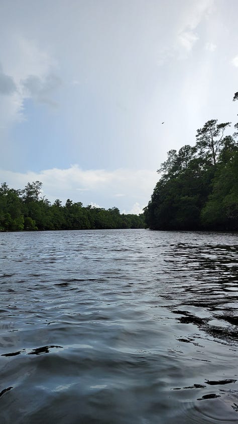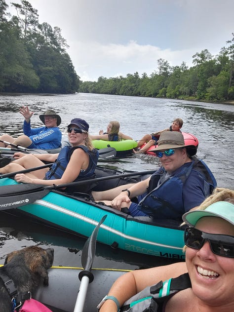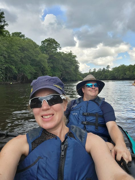 As we floated/paddled down the Edisto River, we experienced sunshine, clouds, sprinkling, and downpour. Despite the unpredictable weather, the pretty river and escape on the water recentered Jeff and me, while leaving our kids tired of working harder than us to keep up. Still, it was worth blowing up the kayaks for the trip down the river and we were glad we had our kayaks along so that we could do it.