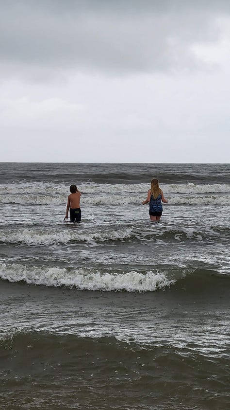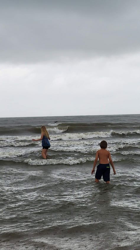 We weren’t quite ready to head back to the state park. We all wanted to see a little bit of Charleston and the kids wanted to see the ocean. Jeff looked up places to go and drove us to the city market where we could walk around town and look at the work of local artisans. It rained while we walked through the Charleston City Market, with some cover as we headed into the indoor portion of the market. Then we headed towards the beaches in hopes that we could find a place to park so we could see the ocean. By the time we found a wet beach, the mist had turned into a solid rain. The kids got into the waves (much to the chagrin of their ocean averse mother) and ignored the rain coming down on them.