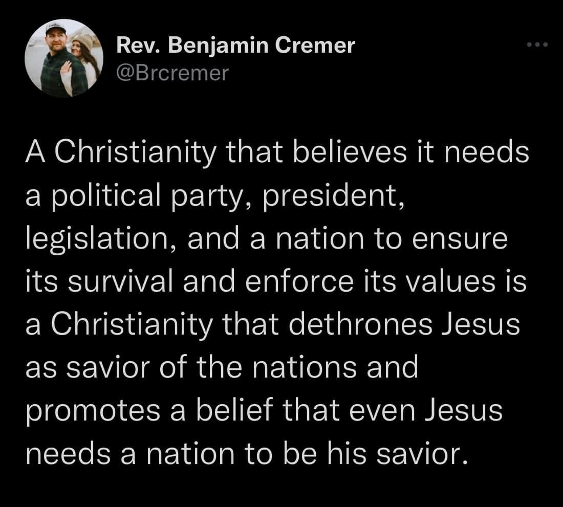 My God is not small. If there is anything to prove that the Creator of the universe is not small, one just needs to look at the images that have come back from the James Webb Space Telescope to understand how big God is. Jesus doesn’t need America to save his kingdom. Reverend Benjamin Cramer said it best in a recent social media post