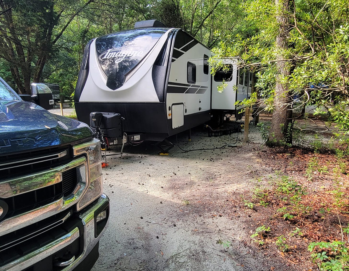 Then we packed up to go. We didn’t get the camper properly hooked up to the truck the first time and it dropped off of the truck, nearly rolling down the hill and getting caught by the two leveler blocks that we had put into place when we parked (camper mishap number four). Then, while we were dumping our wastewater, I discovered that the greywater tanks were not closed and got gross dish and bathroom sink water all over my hands and arms (camper mishap number five).