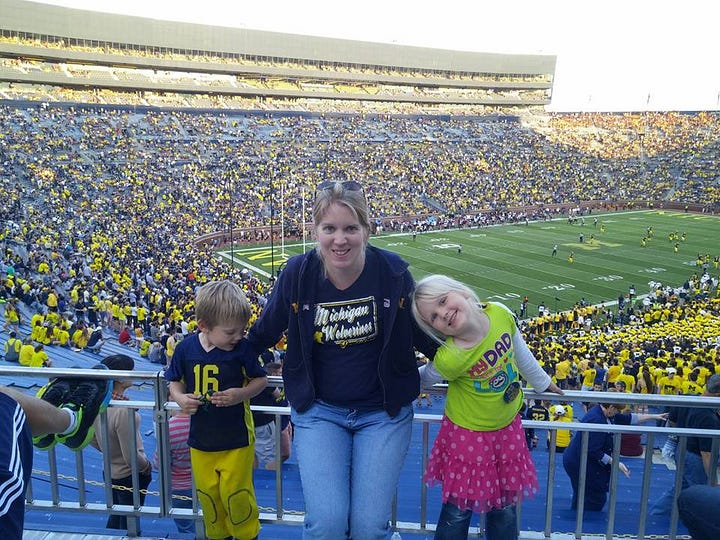 Like many other spouses of University of Michigan fans, I was a long-suffering partner through the Rodriguez/Hoke years. After years of celebrating Michigan wins, I had to deal with a twenty-something, then thirty-something husband who still tortured himself to watch every single game when it was possible. During that terrible period, we attended the surprise victory over Wisconsin in 2008, our daughter still safely hidden in my first-trimester uterus.