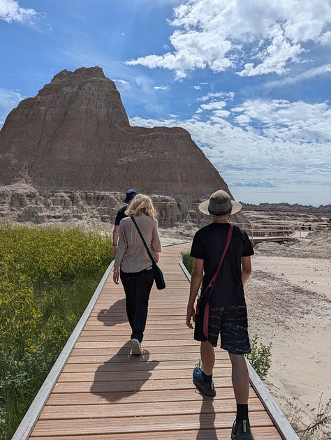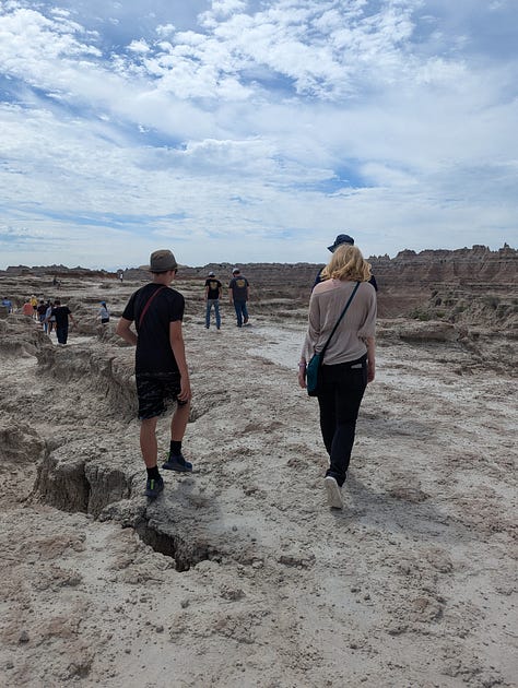 Vacation mode also meant our family slept until mid-morning, even though we had changed two time zones in our drive west. We were quickly learning to change some expectations as we traveled with two teenagers now. We packed up water bottles and snacks and traveled to the Ben Reifel Visitor Center, nearly 30 minutes away. On our way, we stopped to hike the Window Trail, which was more a “choose your own adventure” hike with the goal of reaching numbered posts that told us we were going in the right direction. We quickly discovered that the trail restrictions in Badlands National Park are far looser than in any other park we have visited, mostly because the constantly changing landscape due to natural erosion of the tightly packed rock and mud formations. We climbed up and down the formations, looking for natural landbridges until we reached the final post.