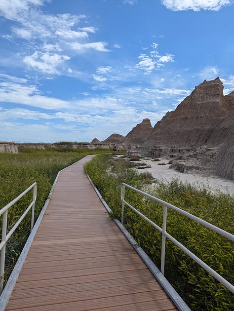I had never heard of the national park before, even with a few drives through South Dakota during my childhood. I knew about Mount Rushmore and the Black Hills, and that was our destination. It was a long drive from our overnight stop in Souix Falls to the KOA I had reserved near Mount Rushmore. We didn’t have much time to sightsee on our way across the state.